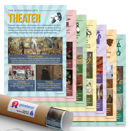 Quarterhouse Types of Performing Arts Poster Set, Music Classroom Learning Materials for K-12 Students and Teachers, Set of 7, 12x18, Extra Durable