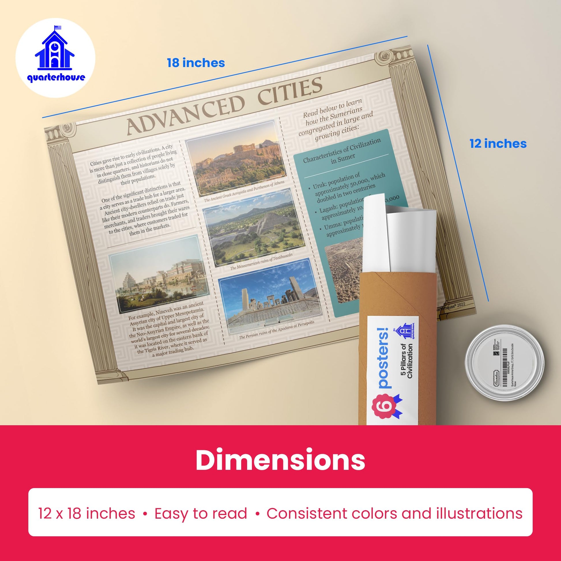 Quarterhouse 5 Pillars of Civilization Poster Set, US History and Civics Classroom Learning Materials for K-12 Students and Teachers, Set of 6, 12 x 18 Inches, Extra Durable