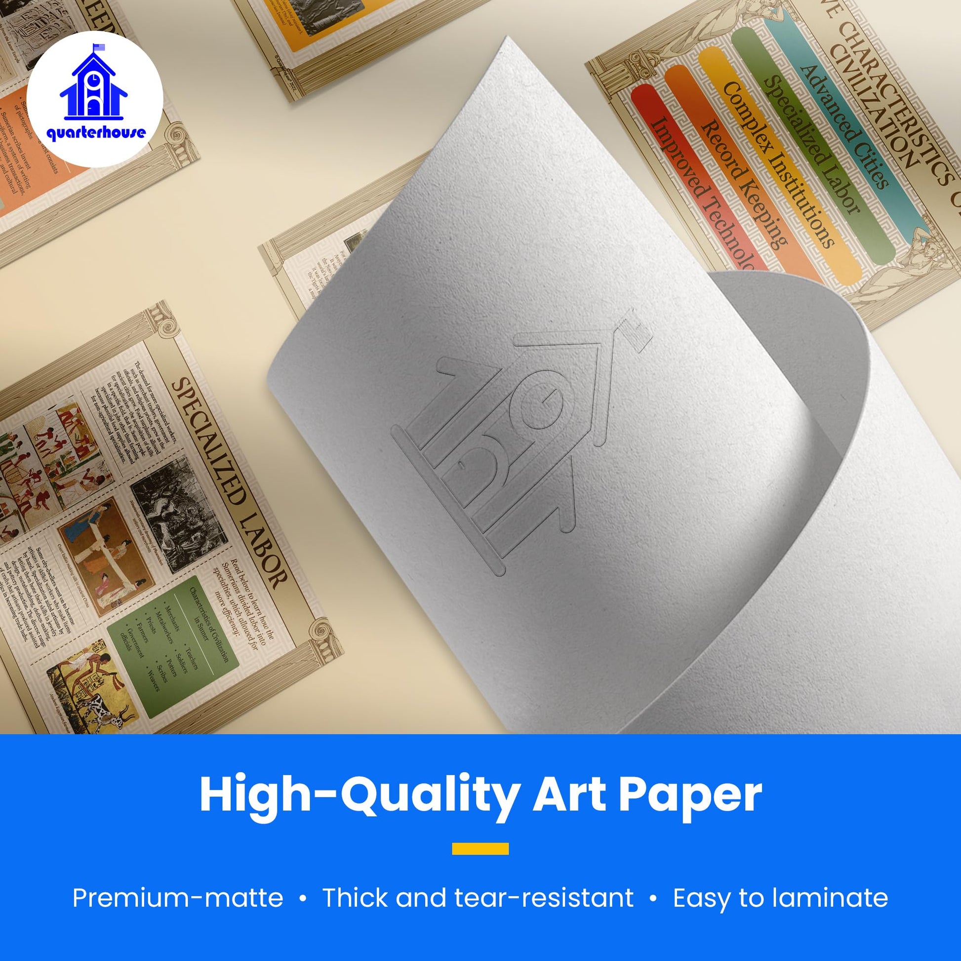 We print each poster on durable, high-quality paper that can withstand the rigors of daily classroom use. With lamination, Quarterhouse posters will last for years without fading or tearing. Additionally, the posters are easy to hang with adhesive strips or push pins, making them simple to display in your classroom.