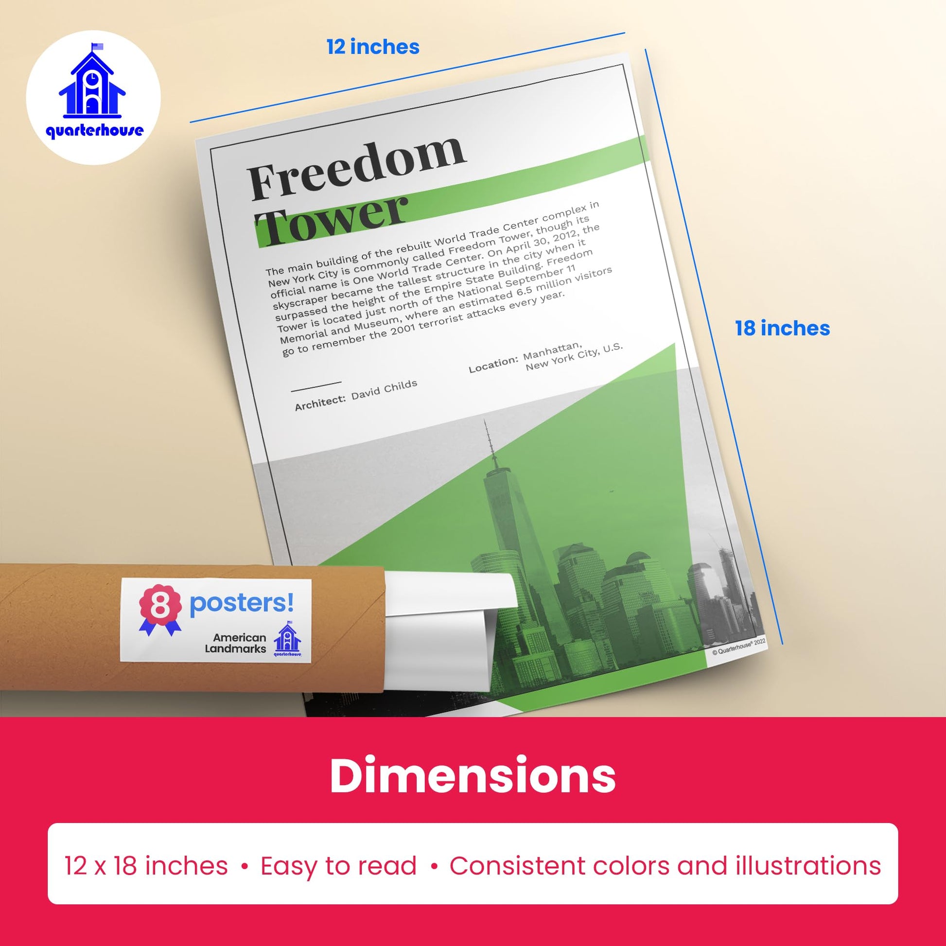 Quarterhouse American Landmarks Poster Set, Social Studies Classroom Learning Materials for K-12 Students and Teachers, Set of 8, 12 x 18 Inches, Extra Durable