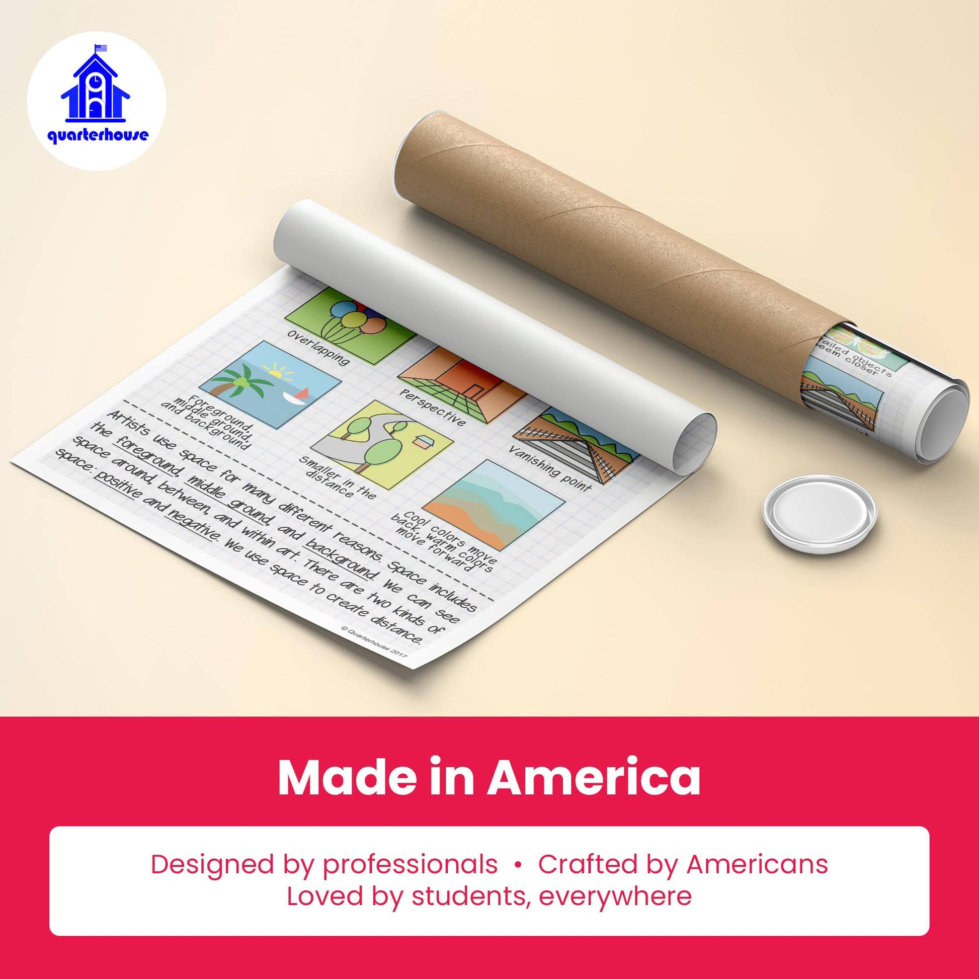 This poster set is part of the Quarterhouse Line of Art Classroom Learning Materials, designed to help teachers create a visually engaging and educational environment for their students. Explore the vast world of space, form, and color—concepts essential to a comprehensive understanding of visual art—from your classroom walls!
