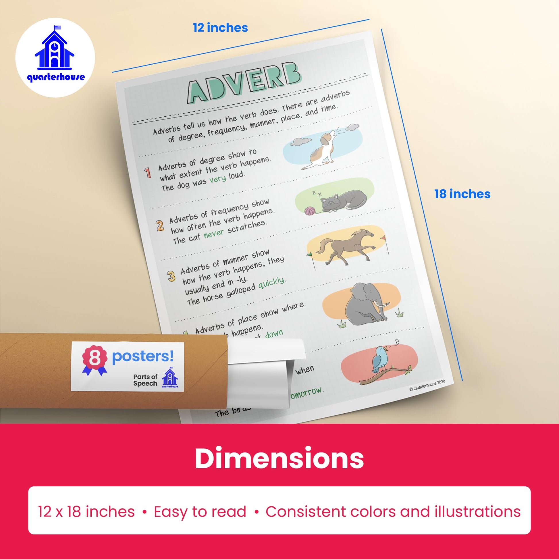 Quarterhouse Parts of Speech Poster Set, English-Language Arts Classroom Learning Materials for K-12 Students and Teachers, Set of 8, 12 x 18 Inches, Extra Durable