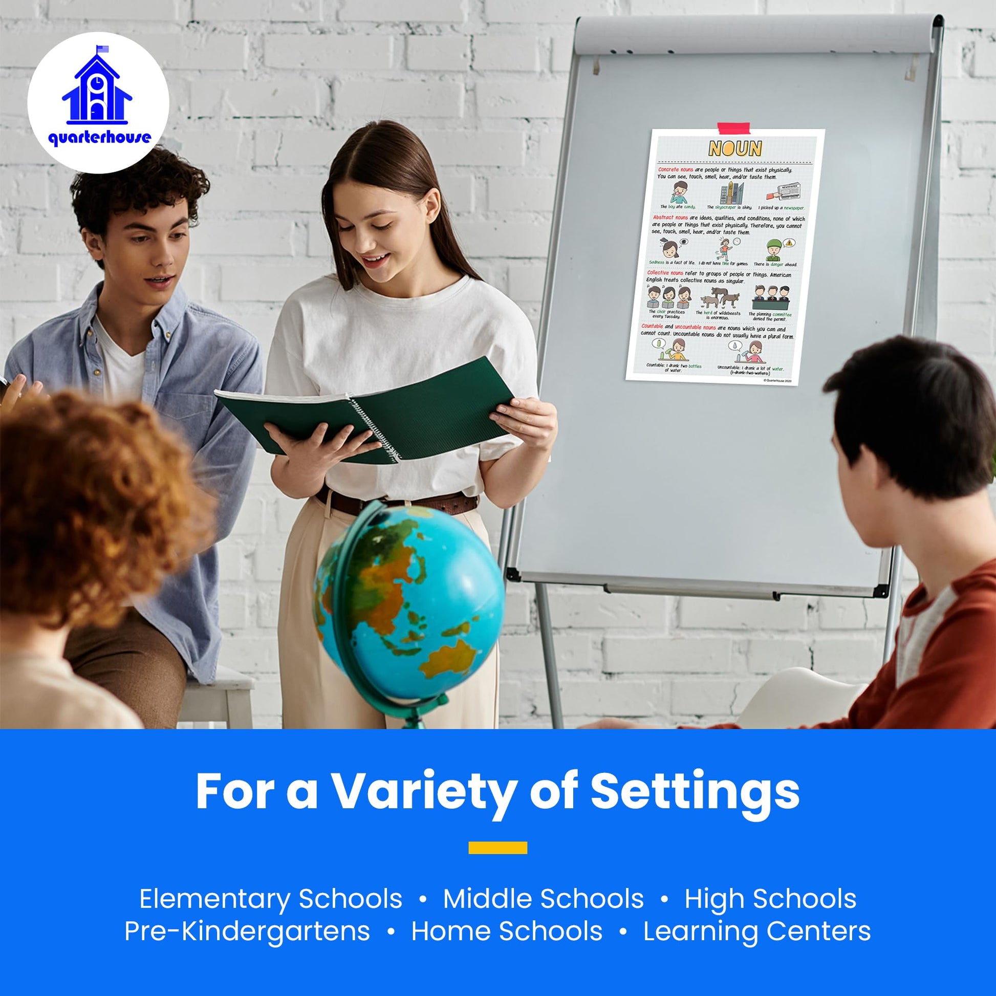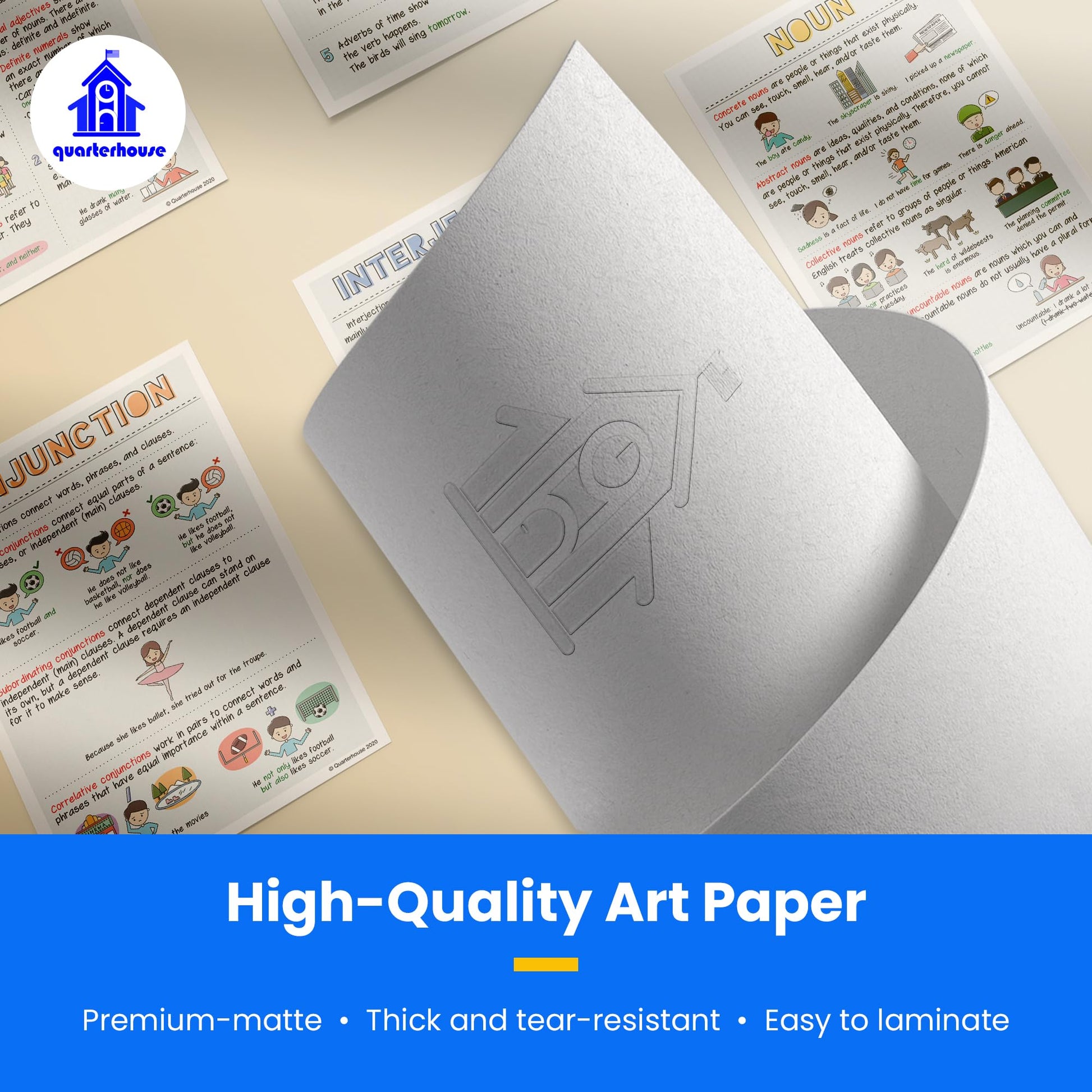 We print each poster on durable, high-quality paper that can withstand the rigors of daily classroom use. With lamination, Quarterhouse posters will last for years without fading or tearing. Additionally, the posters are easy to hang with adhesive strips or push pins, making them simple to display in your classroom.