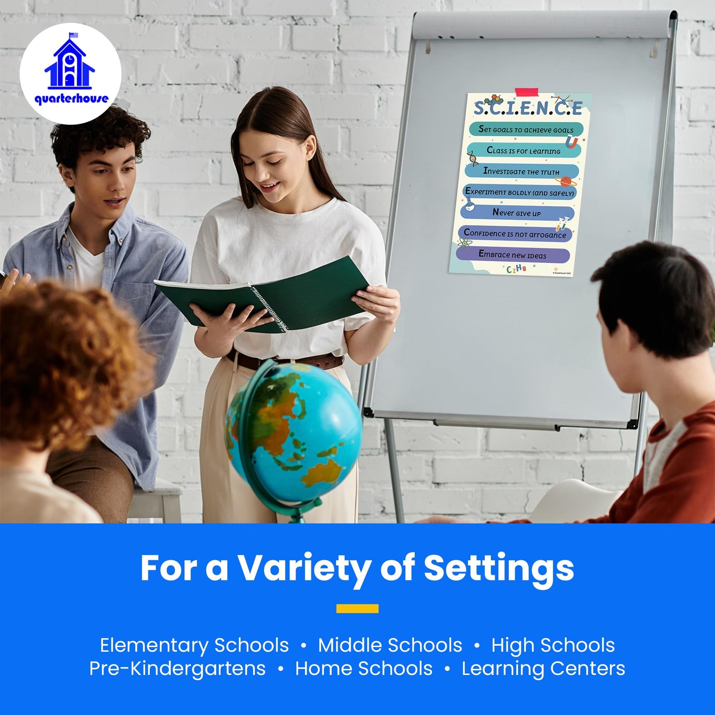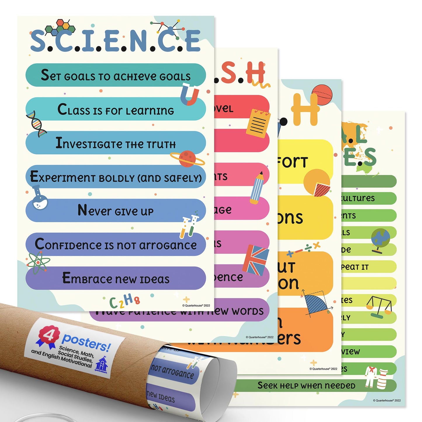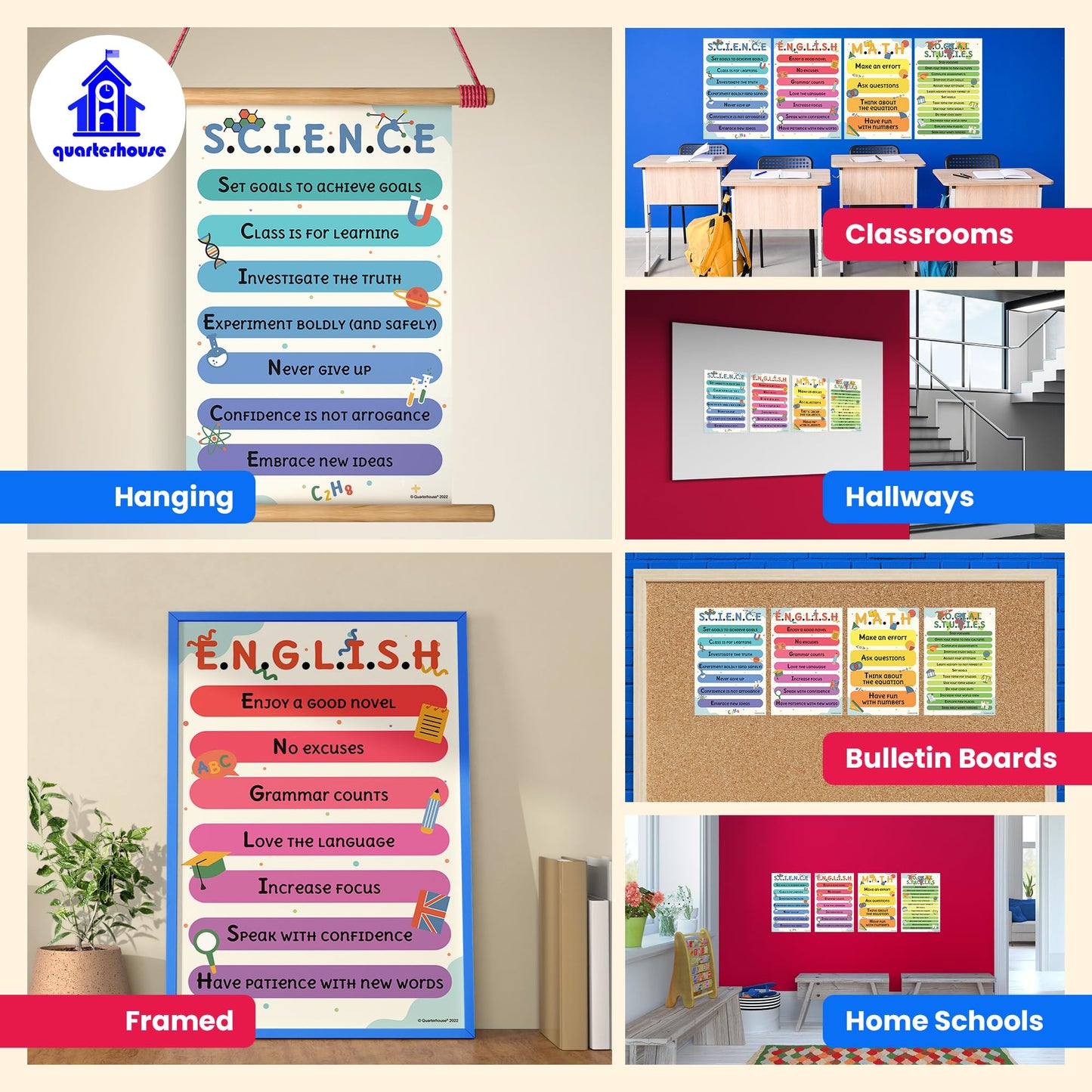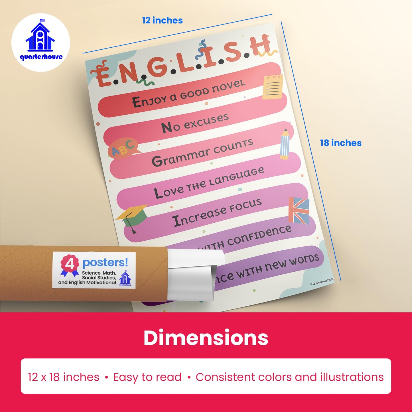 Quarterhouse Science, Math, Social Studies, and English Motivational Poster Set, Elementary Classroom Learning Materials for K-12 Students and Teachers, Set of 4, 12 x 18 Inches, Extra Durable